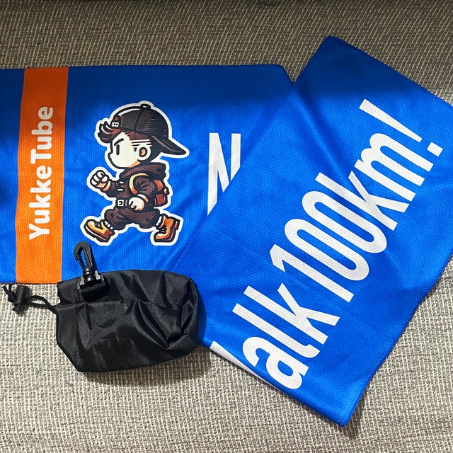 ふっくらとしたボリュームが特徴でしっかり厚みのあるマフラータオル。プリント面は毛足が短く、裏面はふんわりタオル地なので暖かいです。 ユッケ右向きバージョンのほうは「YukkeTube」、バリカンラインの入ったユッケ左向きバージョンのほうは「100km WALKER」の文字が入っていて、首に巻いたときに先端を長めに出すと、どちらかのキャラ+文字が現れます。